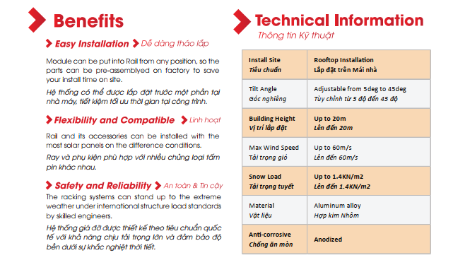 Hệ thống giá đỡ được thiết kế theo tiêu chuẩn quốc tế với khả năng chịu trọng tải lớn và đảm bảo độ bền dưới sự khắc nghiệt thời tiết.