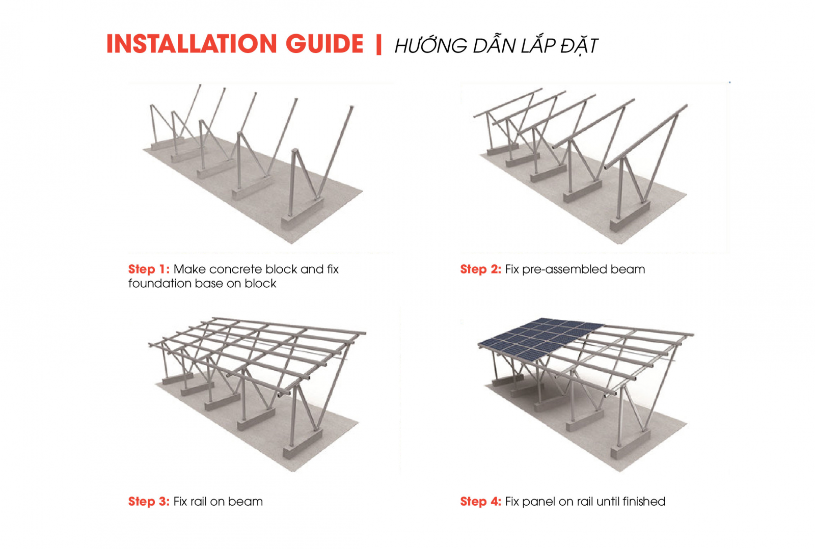 có thể dễ dàng tùy chỉnh để đáp ứng yêu cầu của từng dự án. Các tấm pin sẽ được gắn trực tiếp lên hệ thống ray, tạo thành mái nhà xe thay cho các loại mái thông thường khác. Giải pháp thiết kế ấn tượng này phù hợp với hầu hết các ngôi nhà và bãi đỗ xe.