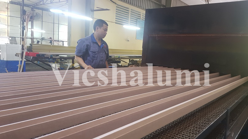 Profile được nung nóng đến hơn 200 độ C và kết thúc hiệu ứng gỗ liên kết với profile nhôm trên tất cả các bề mặt của nó.