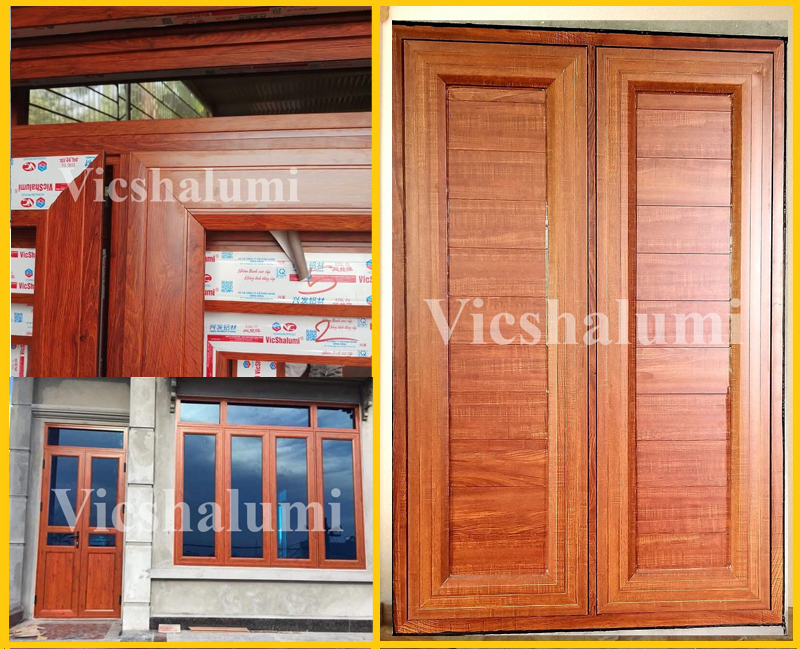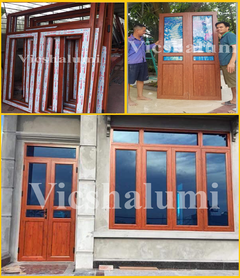 1.Cửa nhôm hệ ngoại thất Vic55 mầu vân gỗ, cửa đi, cửa sổ