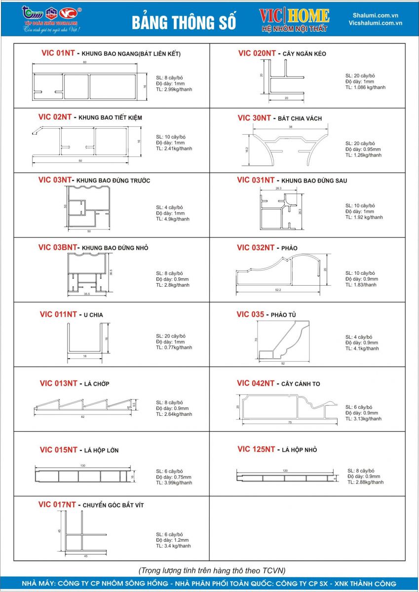 Thông số nhôm nội thất Vichome