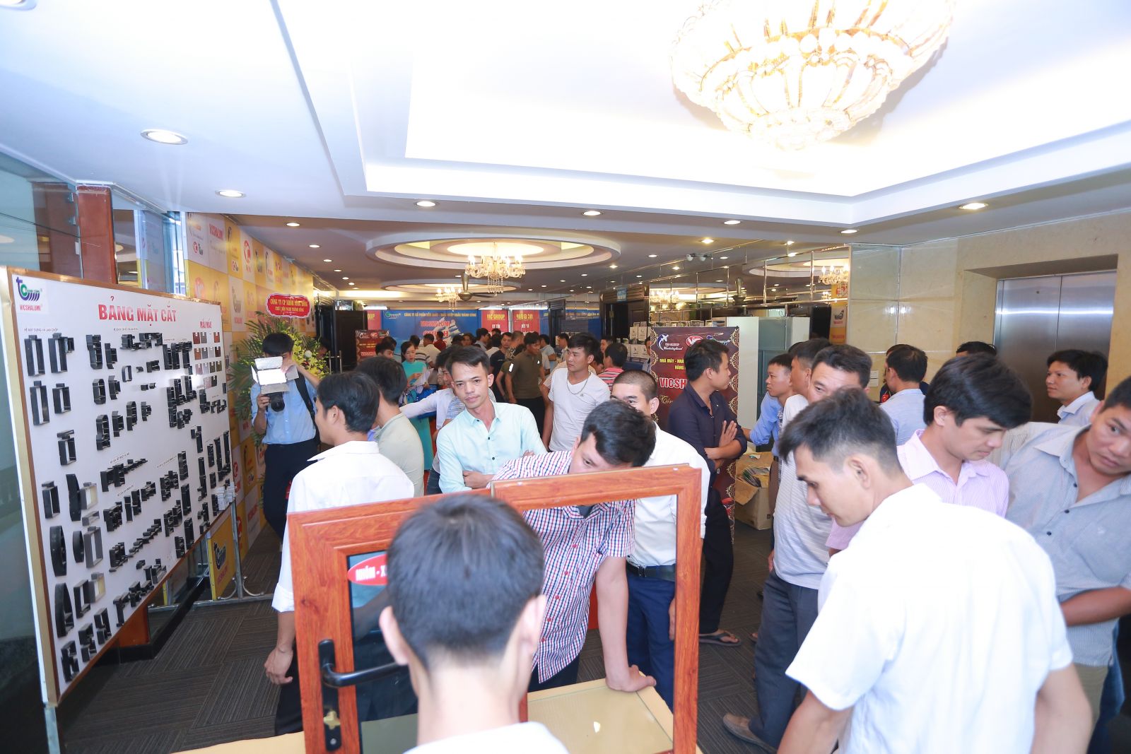 Khách hàng thăm quan mẫu cửa và bảng mẫu nhôm tại sự kiện.