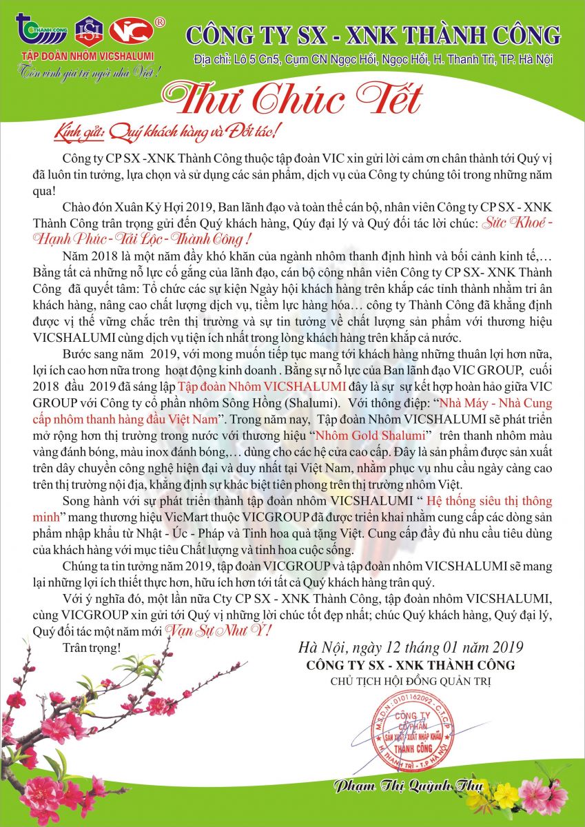 Thư Chúc Tết Của Chủ Tịch HĐQT - TGĐ Phạm Thị Quỳnh Thụ Tới Quý Khách Hàng Nhân Dịp Năm Mới 2019