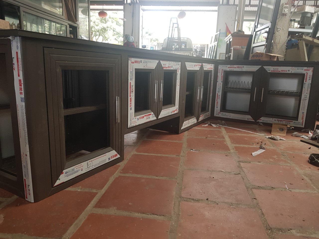 Thông thường tủ bếp nhôm kính được lắp từ các nhôm định hình bình thường, nhôm Việt Pháp bởi giá thành rẻ hơn, mục đích sử dụng của tủ bếp không cần nhiều tính năng như cửa ra vào nên người ta thường lựa chọn dòng nhôm giá rẻ để lắp đặt.