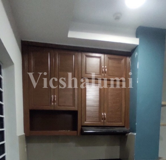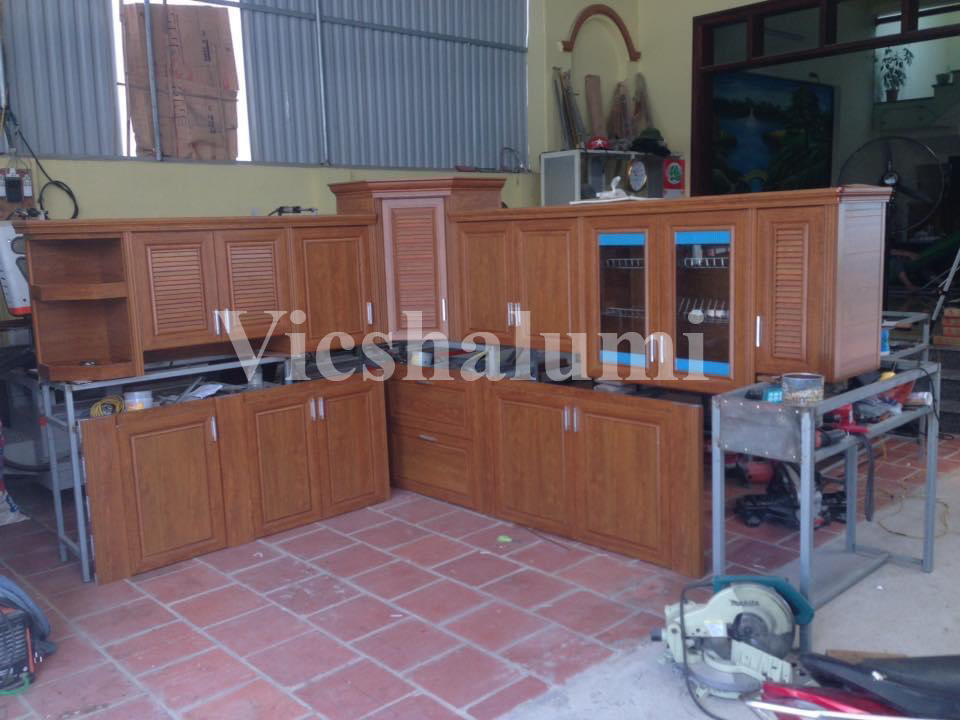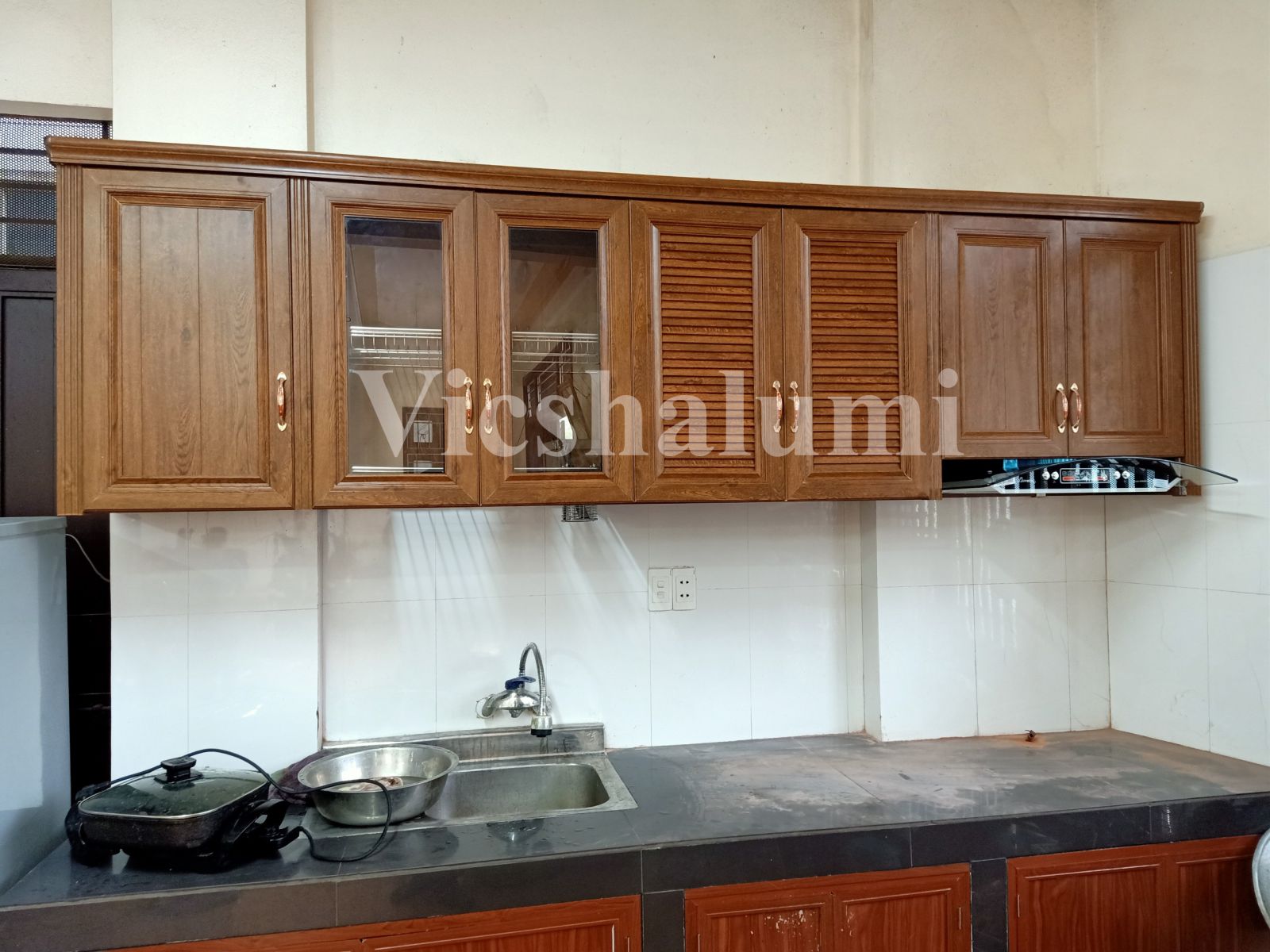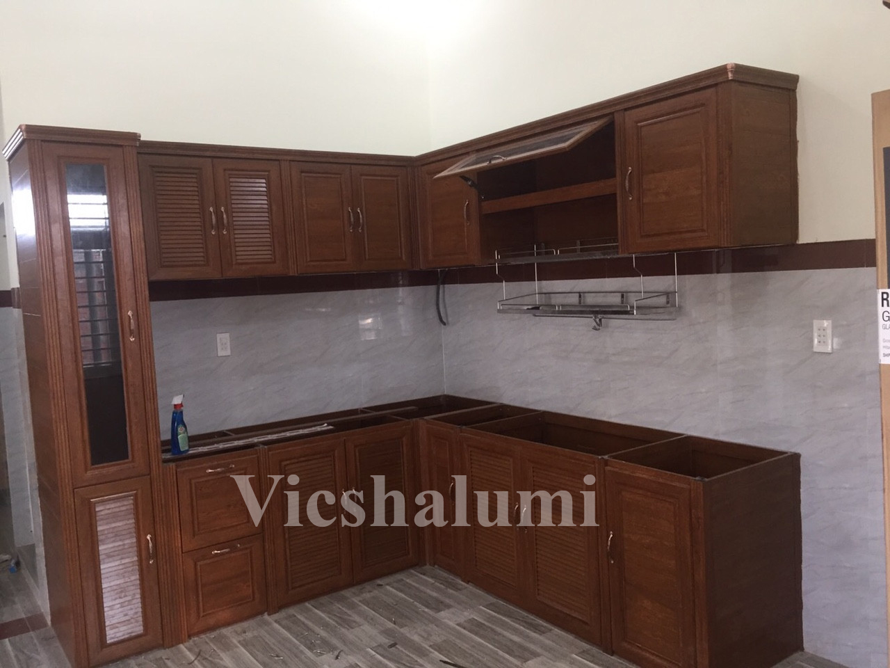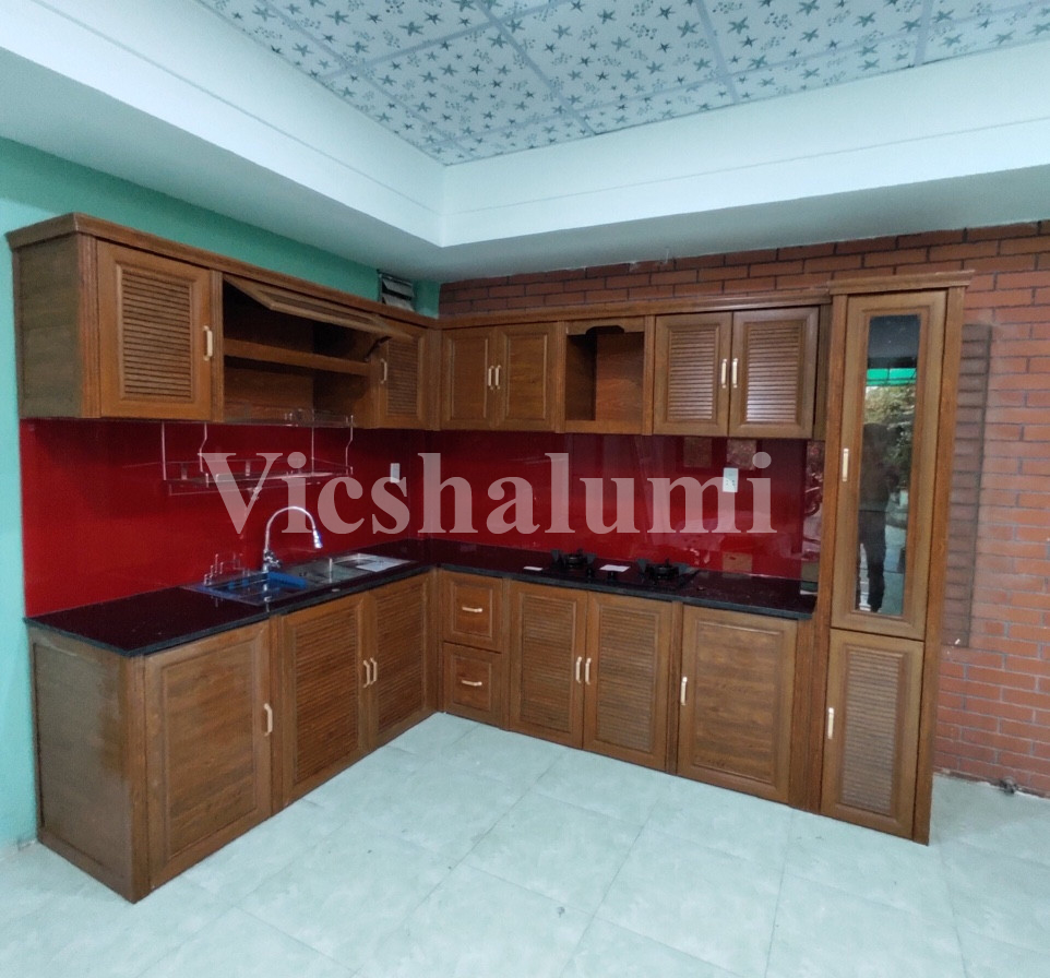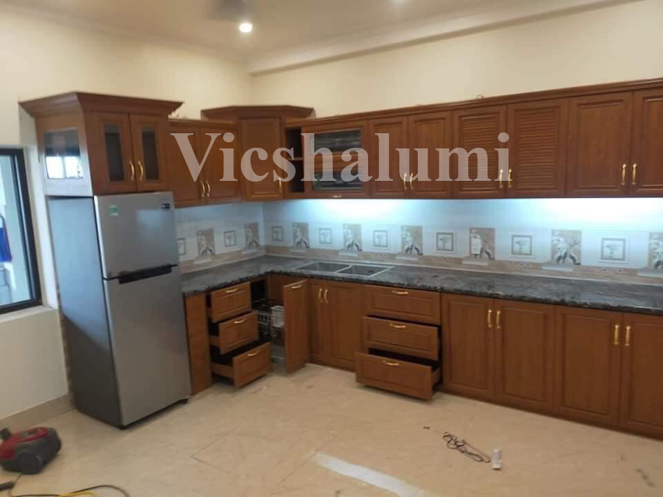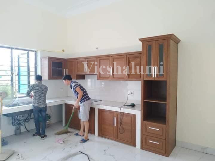 Mẫu tủ bếp nhôm vân gỗ được thi công lại nhà máy cửa nhôm cao cấp Vichamumi Group